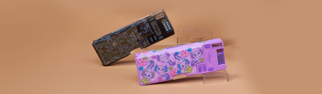 Always surprising and always entertaining our pencil boxes and pop out pencil cases have playful, interactive push buttons that pop-out with things like an eraser drawer or a pencil sharpener drawer. They’re loads of fun and totally practical at the same time!